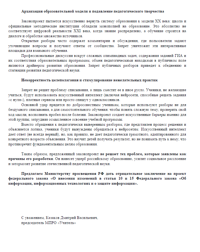 Основной удар придется по добросовестным ученикам, которые используют разборы не для бездумного списывания, а для самостоятельного обучения: чтобы понять сложную тему, проверить свой ход мысли, восполнить пробел после болезни. Законопроект создает искусственные барьеры именно для этой группы, затрудняя осмысленное освоение учебной программы».